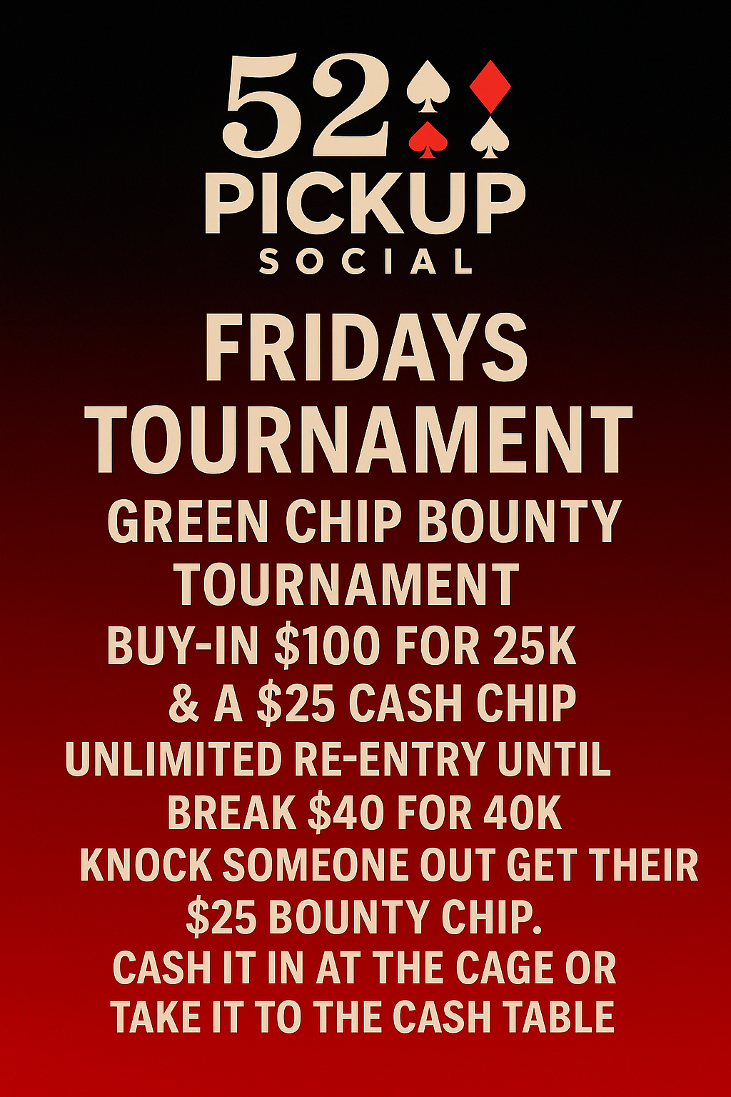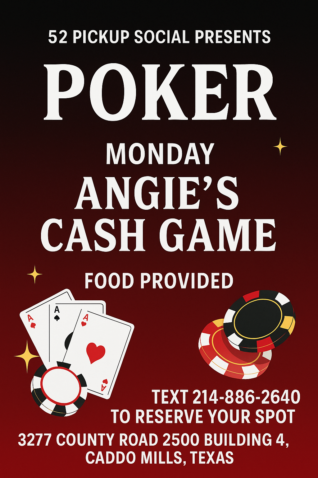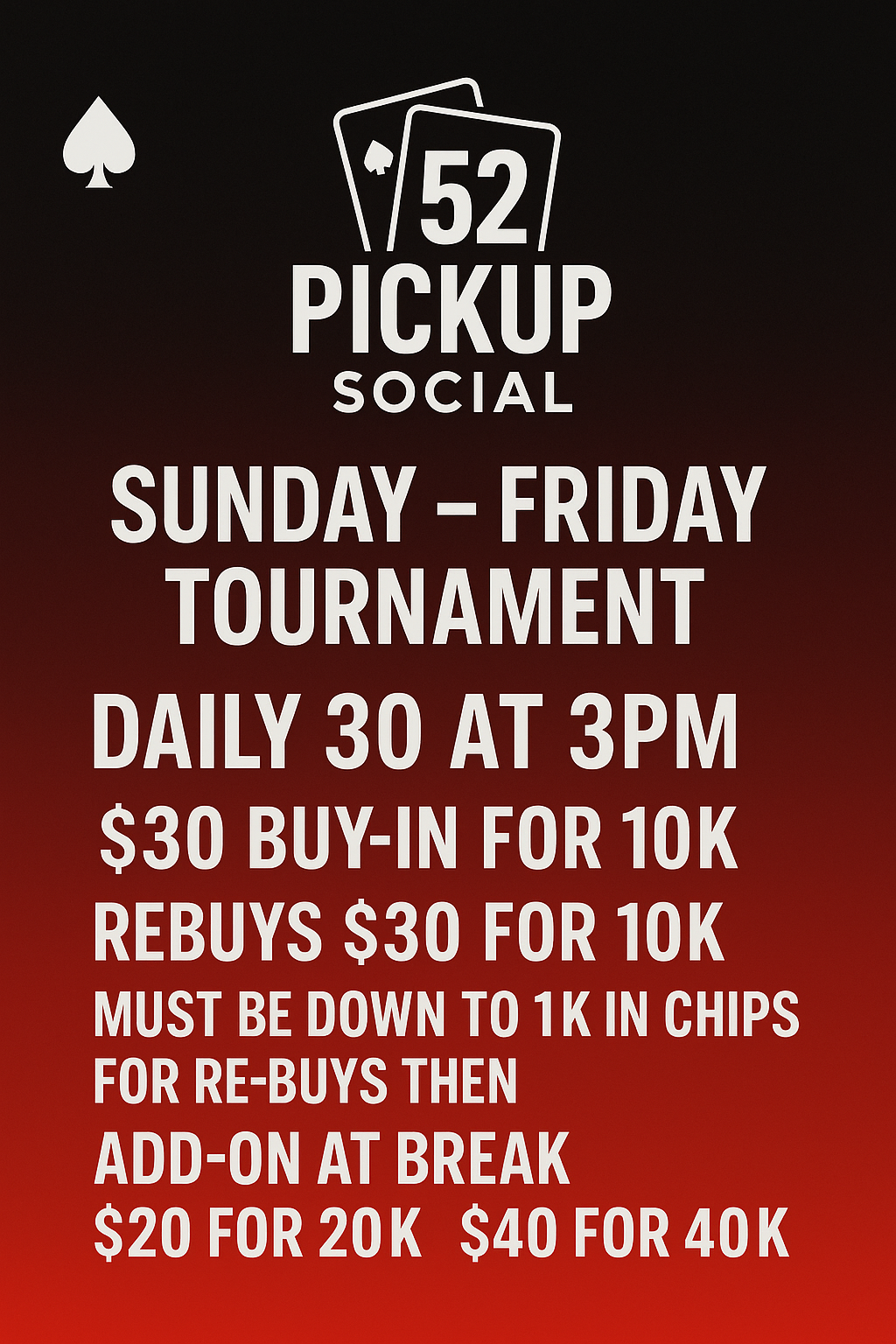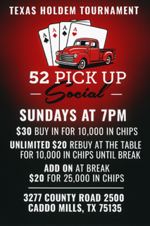Well to tell you the truth, we dont actually play any 52 card pick up. The name just sounded good. But you will be playing all the poker classics you know and love. In a secure, well appointed, comfortable social club. We have the finest dealers in the DFW area with years of experience and complete knowledge of the games they deal. For additional security we have full video surveillance of every table and a floor managers to make final calls on disputed hands. Come on out and let us show you how a poker room should be.
